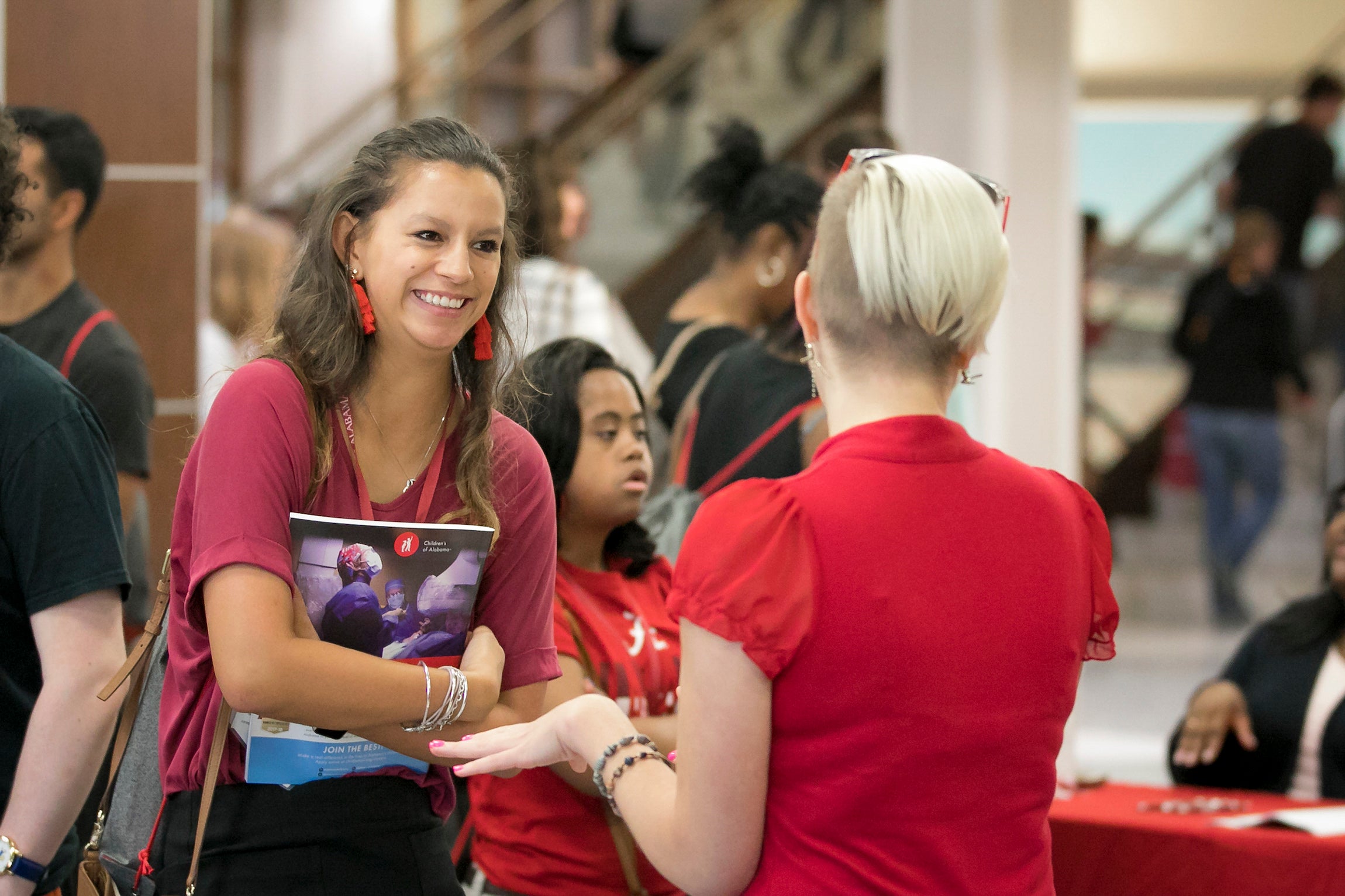 TELL ME MORE: Olivia Baker, of Tuscaloosa, and Melissa Walker visit information tables at Bama Bound.