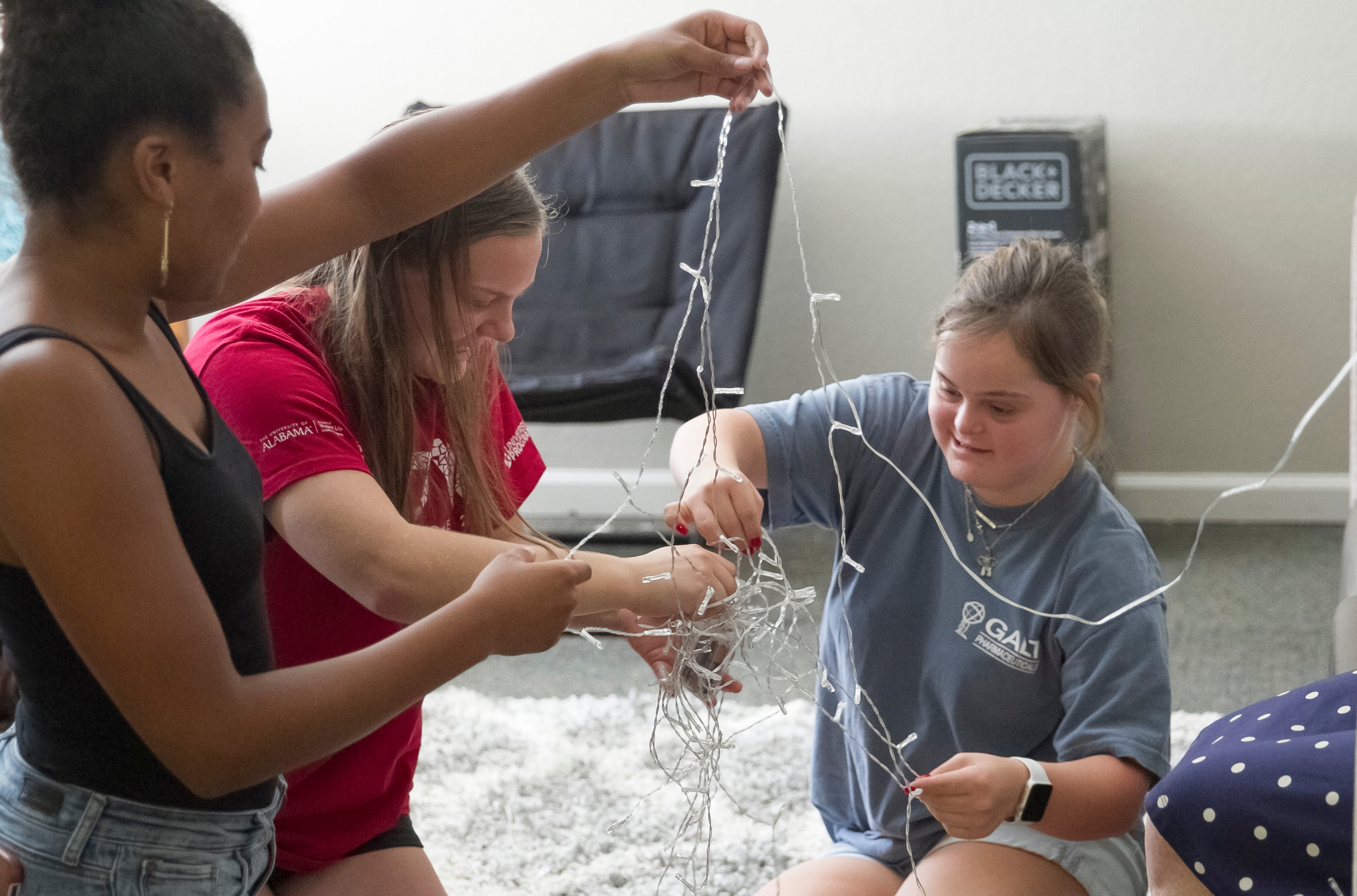 WE’LL GET IT, EVENTUALLY: Maeghan DeLoach (right) and CCOS RA Kourtney Clark (left) and roommate Stephanie Slaven work to untangle holiday lights to hang in the shared space of their dorm room.