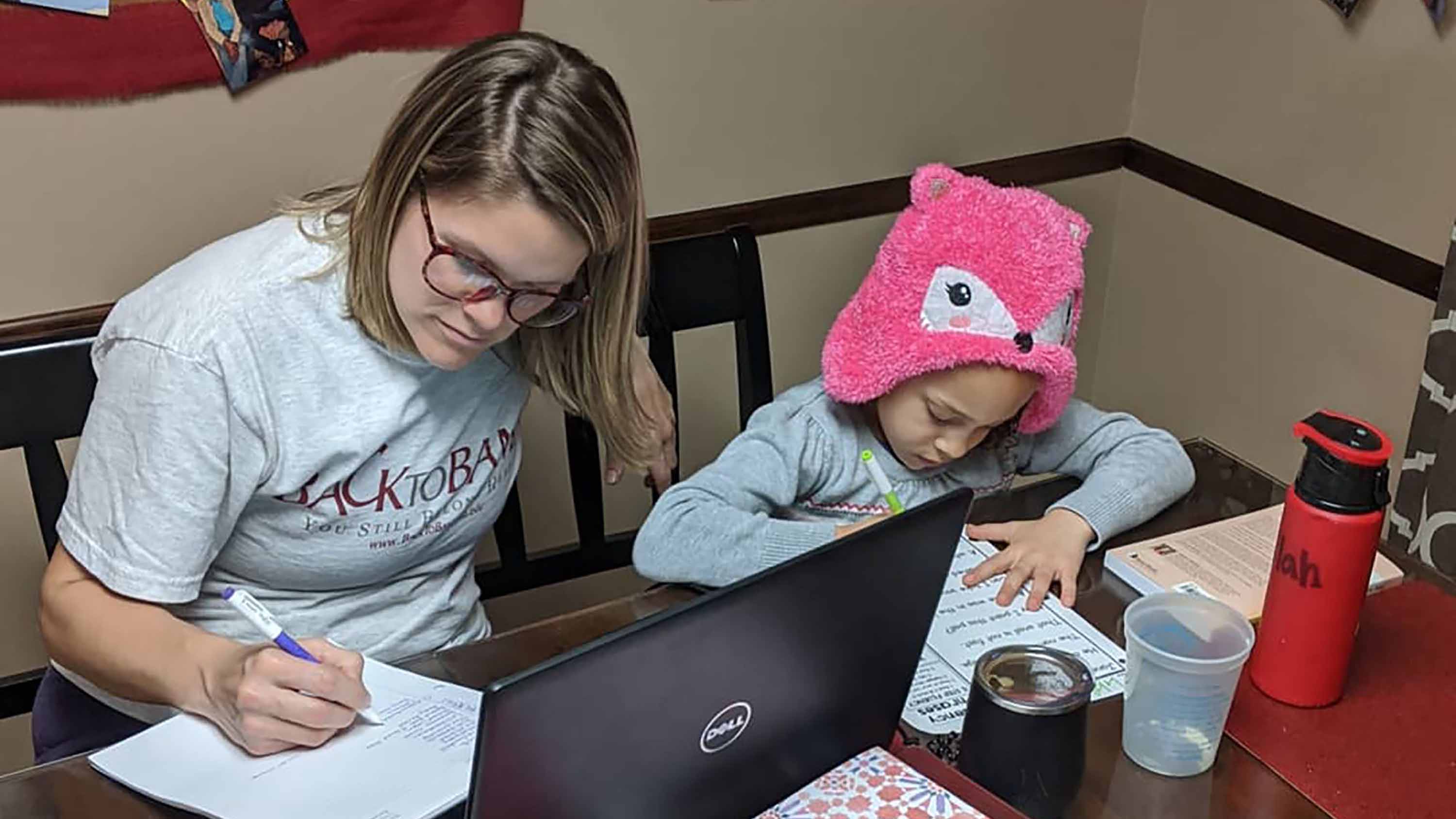 Amy Nichols, content coordinator for Bama by Distance, and her daughter Lilah are both keeping up with work and school from their kitchen table.