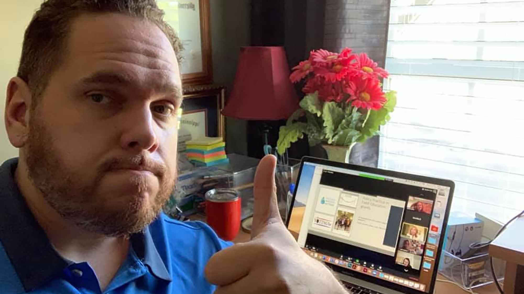 Thumbs up! David Miller, communications specialist with the School of Social Work, is pleased with his at-home setup.