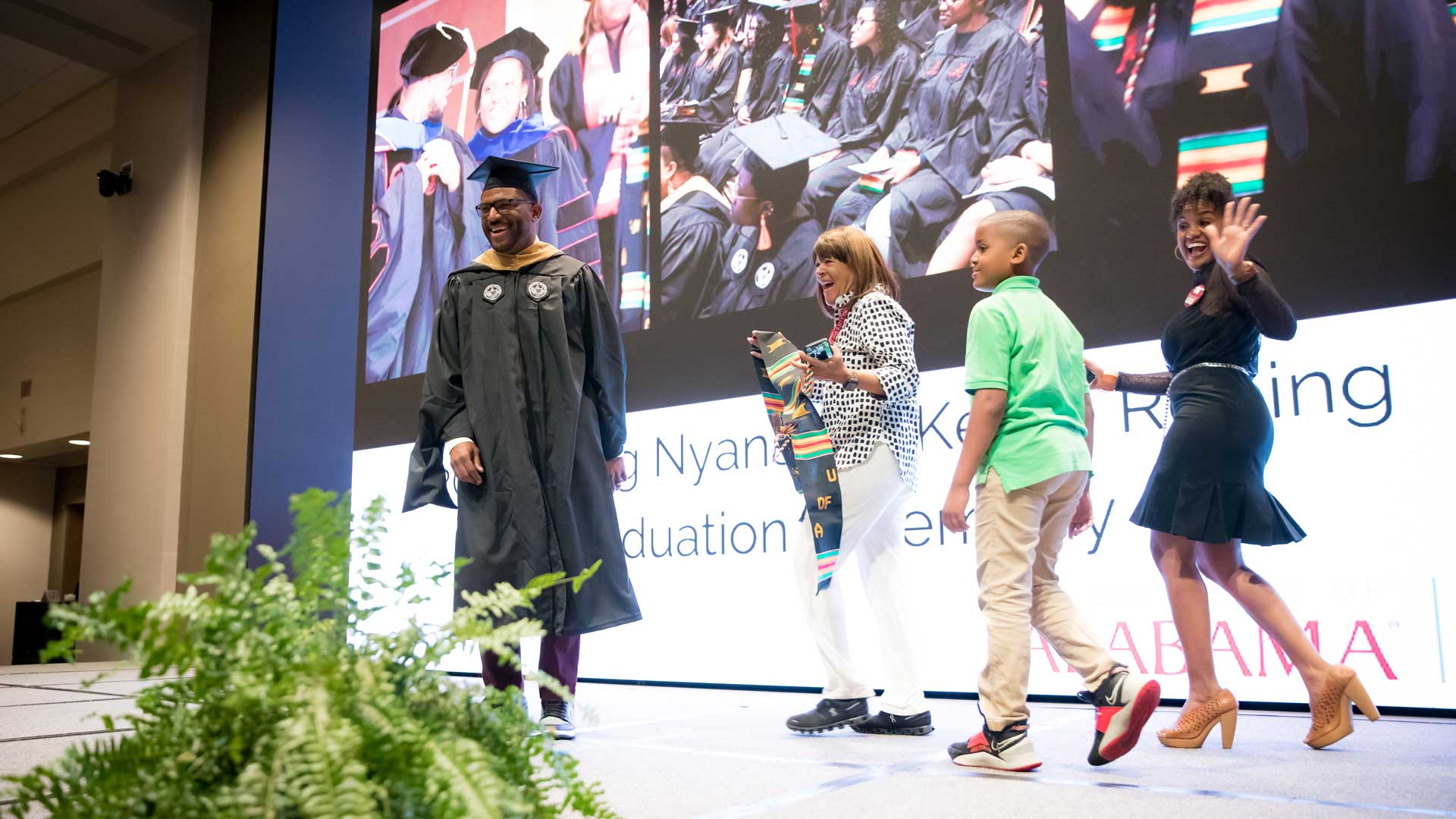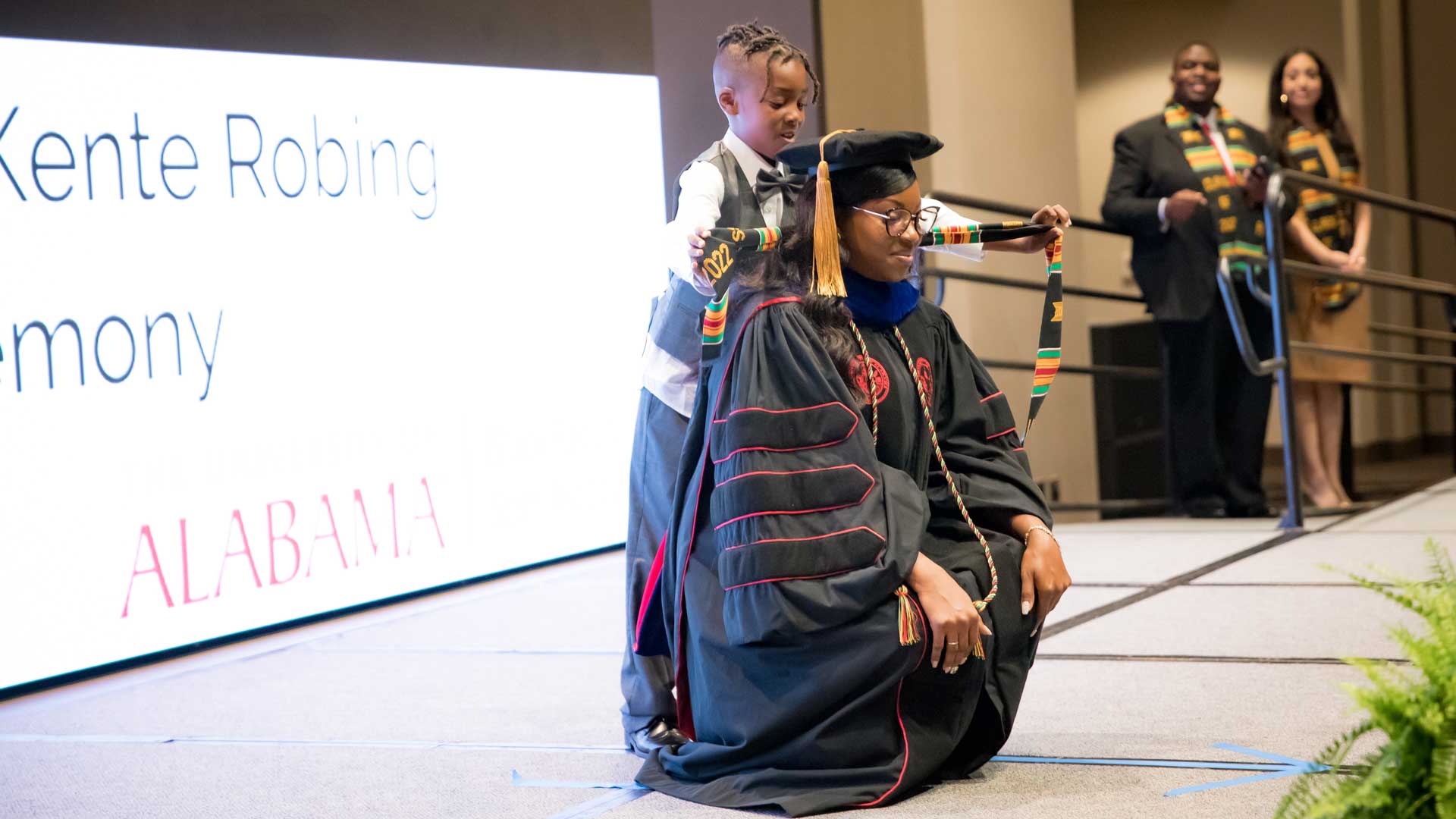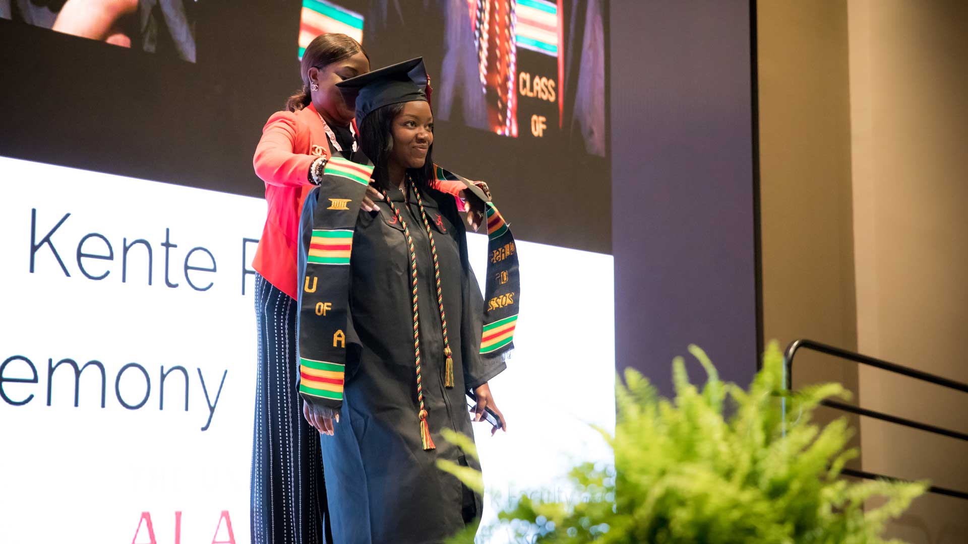 Hosted by the Black Faculty and Staff Association, the Nyansapo Kente Robing Ceremony celebrates the significant achievement of graduating from The University of Alabama.